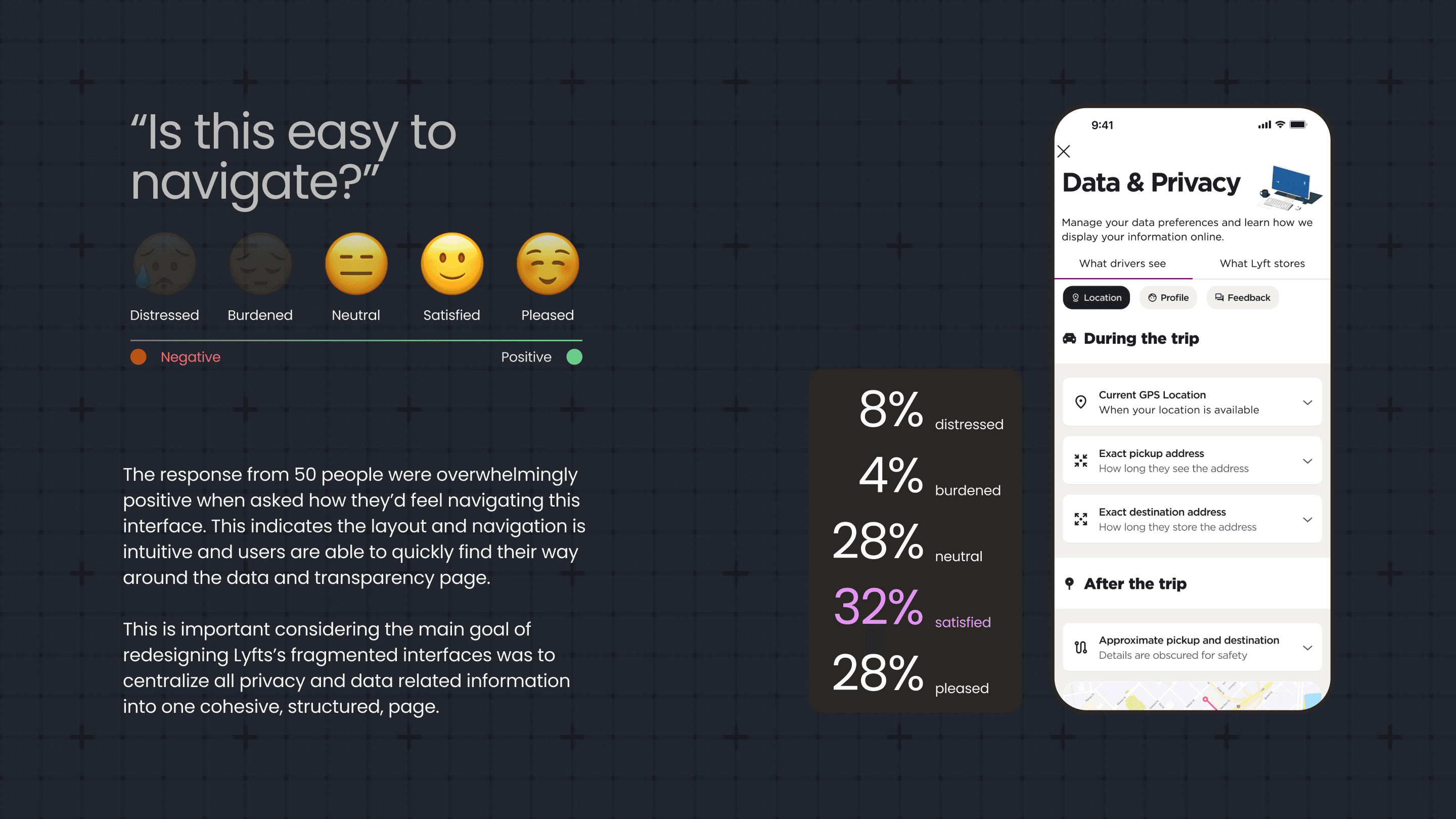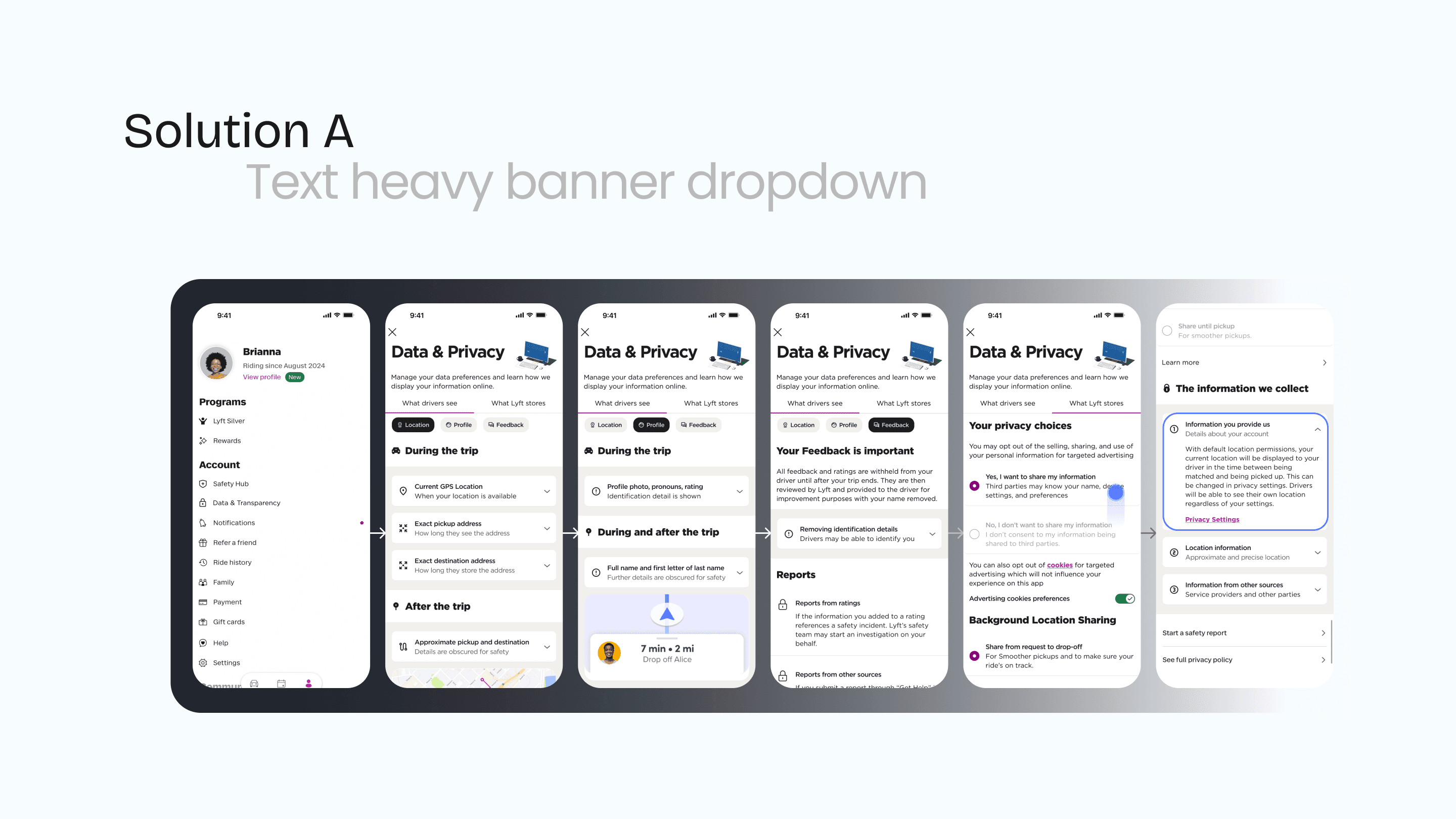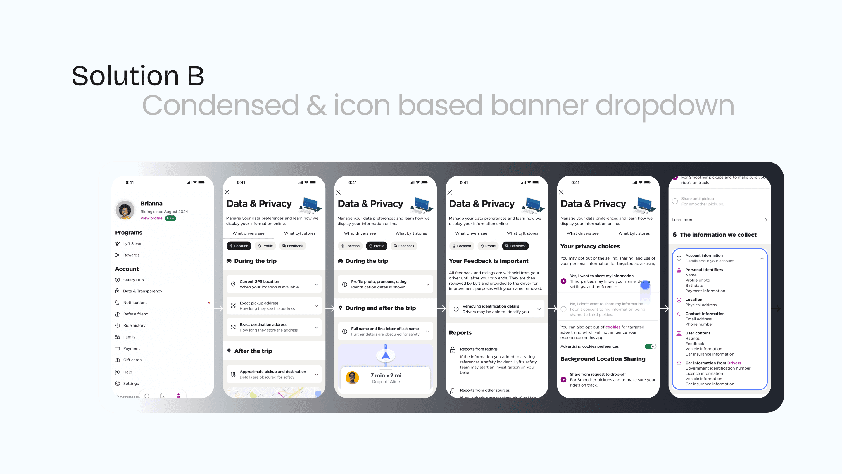 The final solution improves how users interact with Lyft’s privacy and data information by making it more structured, intuitive, and easier to navigate. By organizing content into clearly defined tabs and simplified decision points, users can quickly understand what data is collected, how it is used, and what control they have over it without feeling overwhelmed.