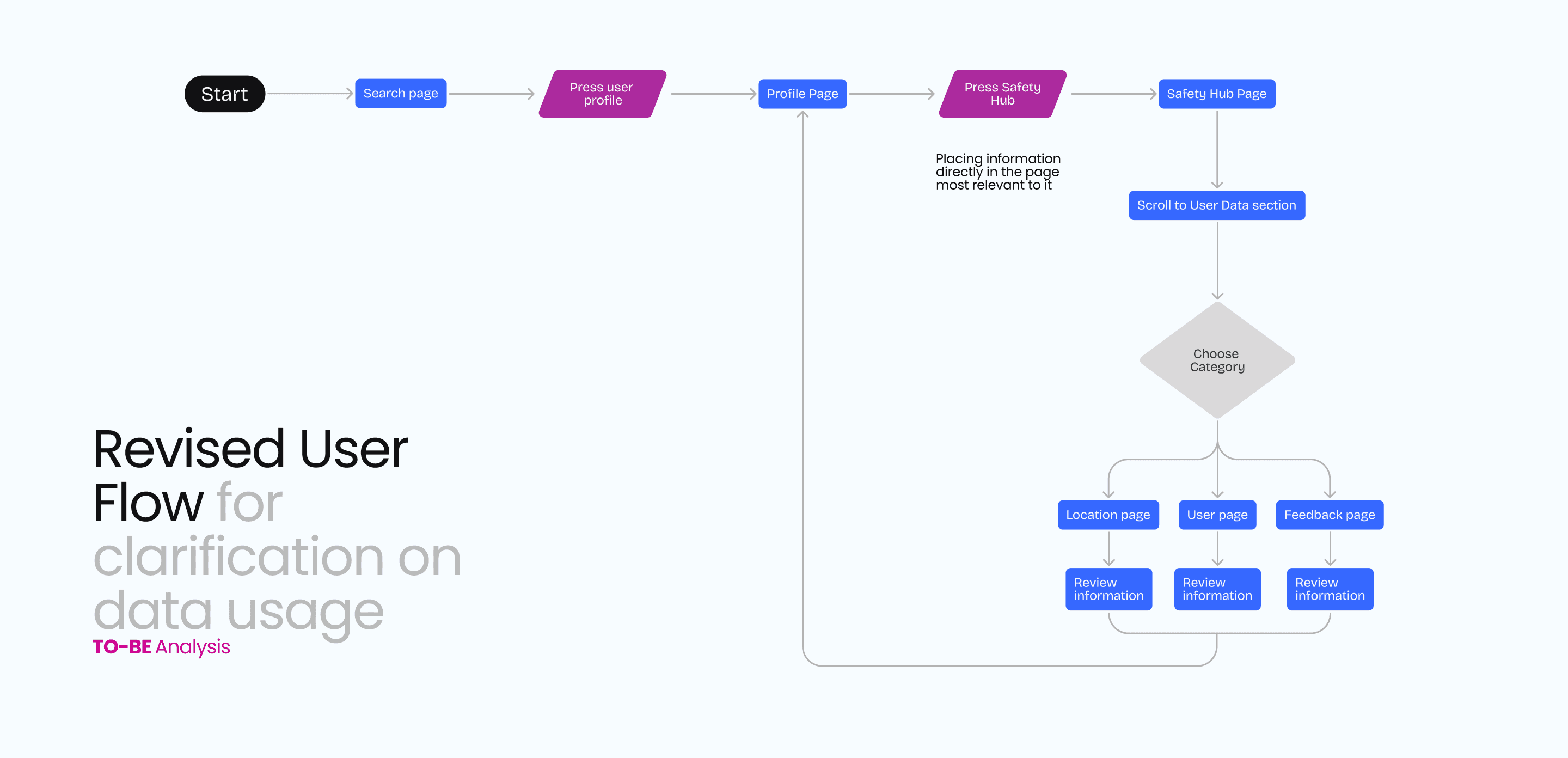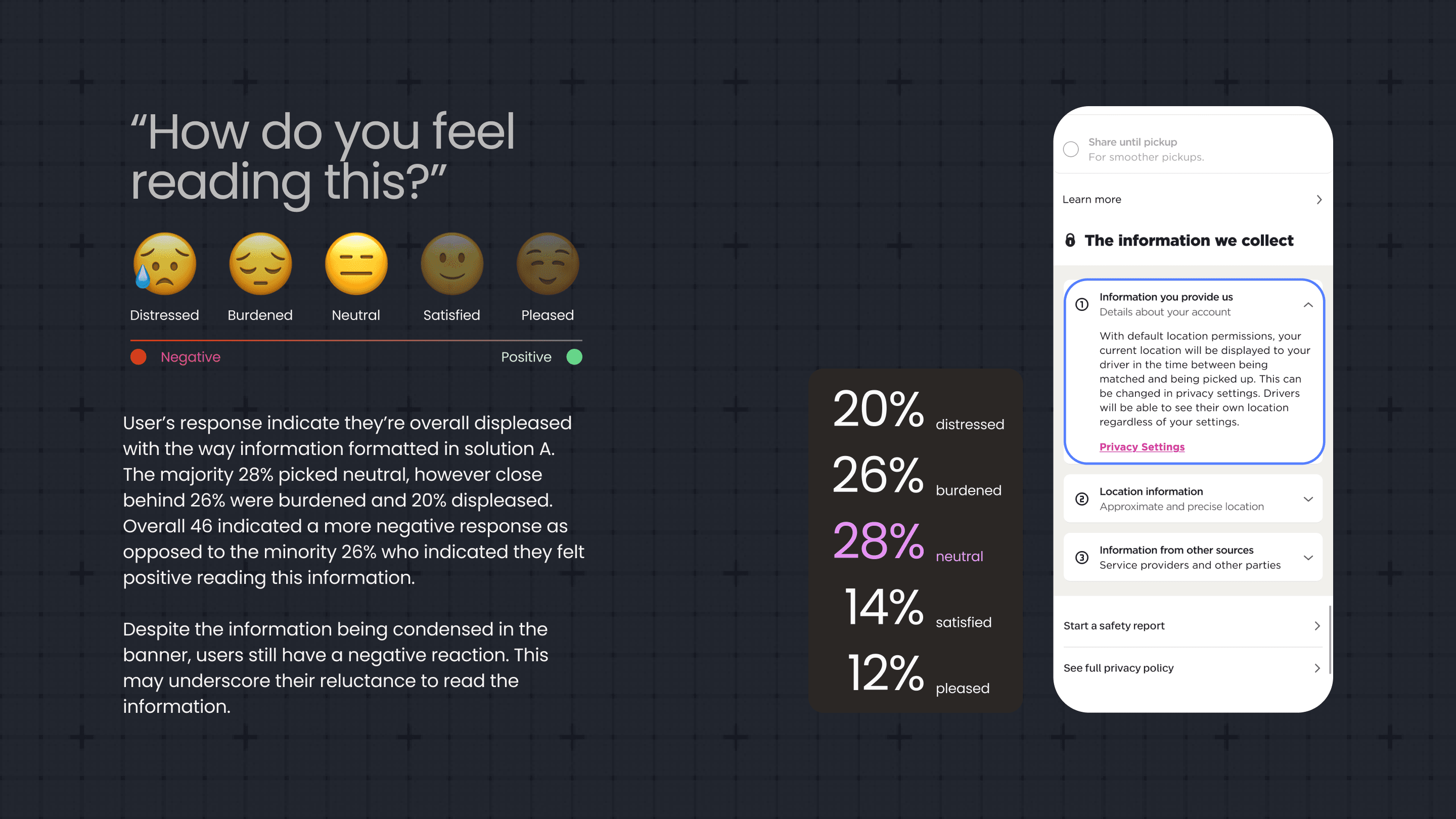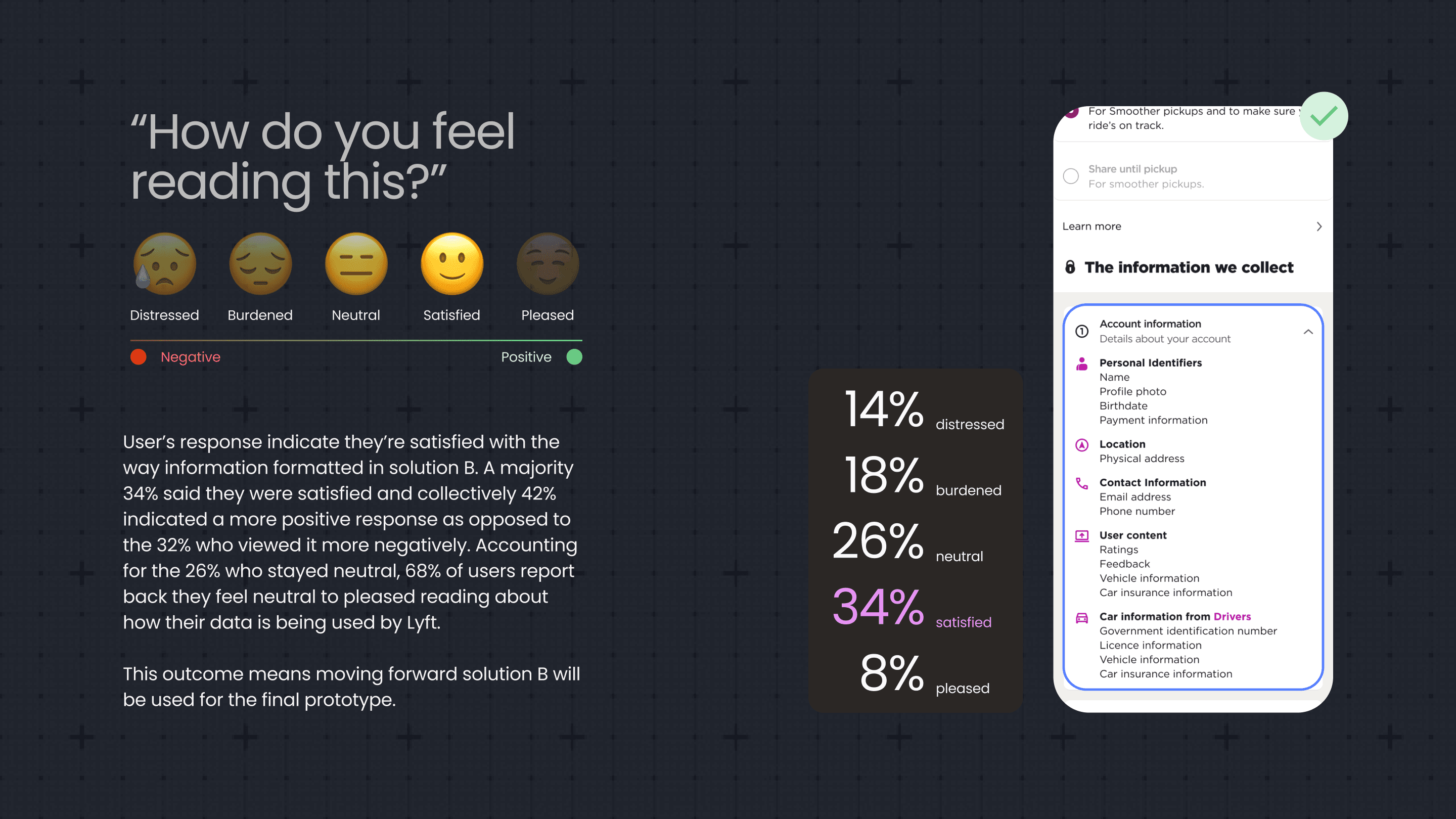 The final solution improves how users interact with Lyft’s privacy and data information by making it more structured, intuitive, and easier to navigate. By organizing content into clearly defined tabs and simplified decision points, users can quickly understand what data is collected, how it is used, and what control they have over it without feeling overwhelmed.