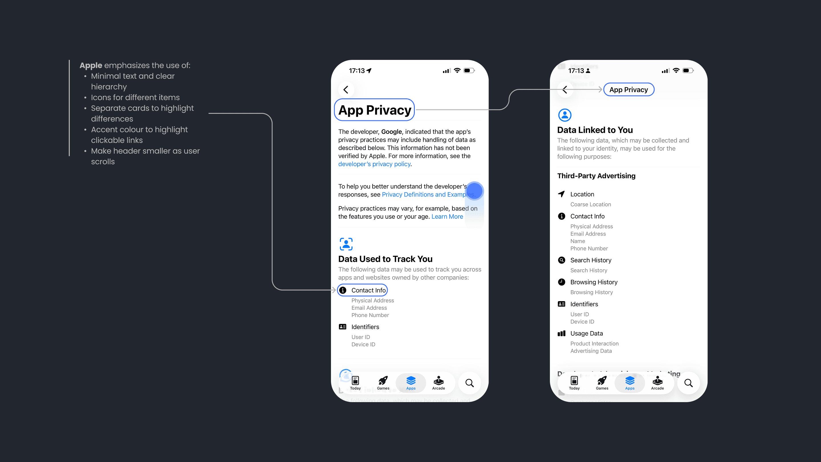 One of the biggest proponents of data transparency lately and empowering users is Apple, specifically how the app store details which data is linked to users and which are collected.