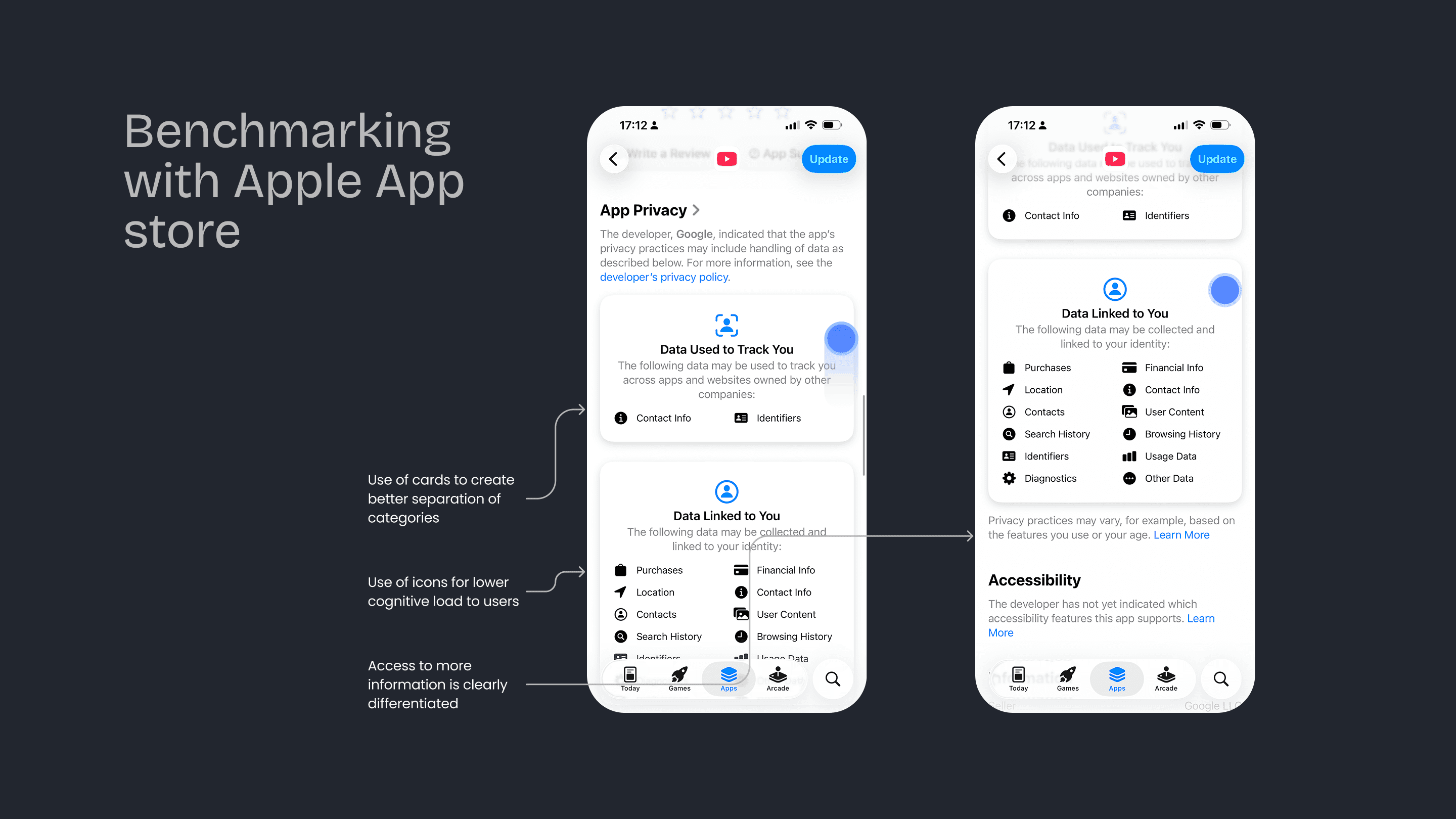 Two different iterations were considered for the final solution, the first focused on a condensed privacy statement while the second organizes the information with icons inspired by the Apple app store interface.